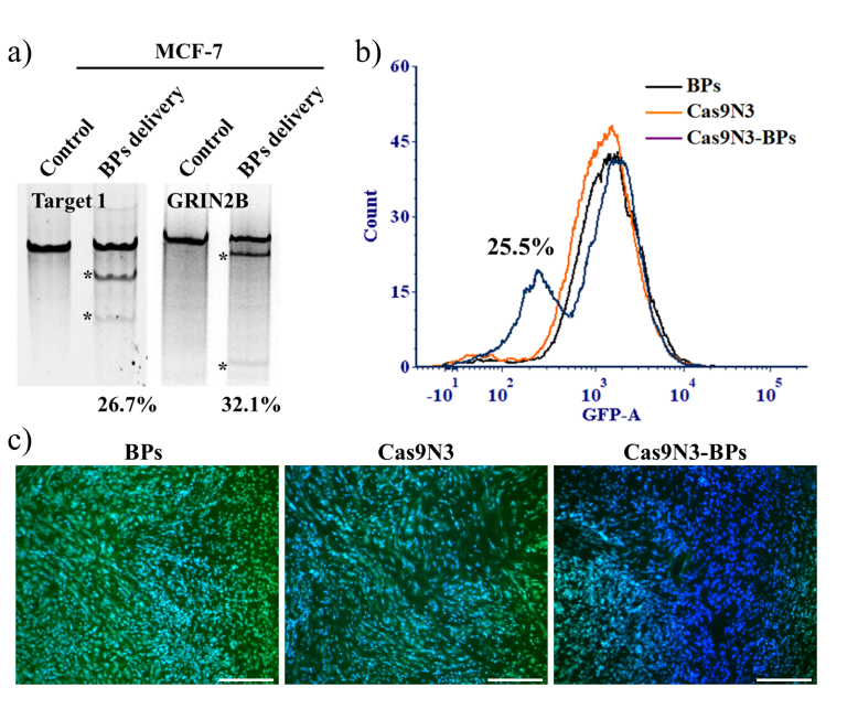 图3: 基于黑磷纳米片的Cas9-sgRNA复合体转运体系:(a)在细胞株MCF-7内实现高效的基因编辑;(b)在细胞株EGFP/A549及(c)动物荷瘤模型的EGFP位点实现了高效的基因沉默和基因编辑。