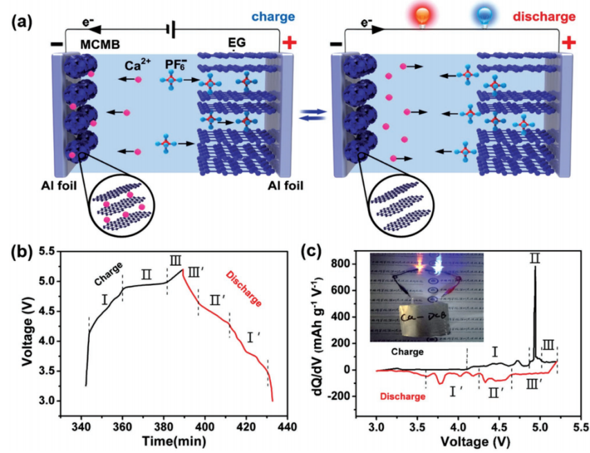 图(a) 基于双碳结构的钙型双离子电池的充放电机理示意图;(b)充放电曲线图;(c)dQ/dV曲线图。