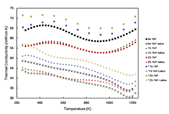 图1.样品热导率随温度的变化,在不增加锗含量的前提下,YbP在合金中的掺杂有效降低了材料的晶格热导率