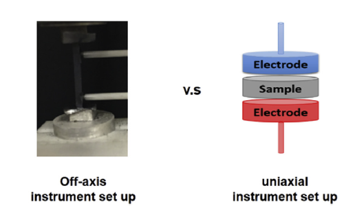 图2.研究对比的两种不同的塞贝克系数测量原理: 左图为异轴法测量,右图为同轴法测量