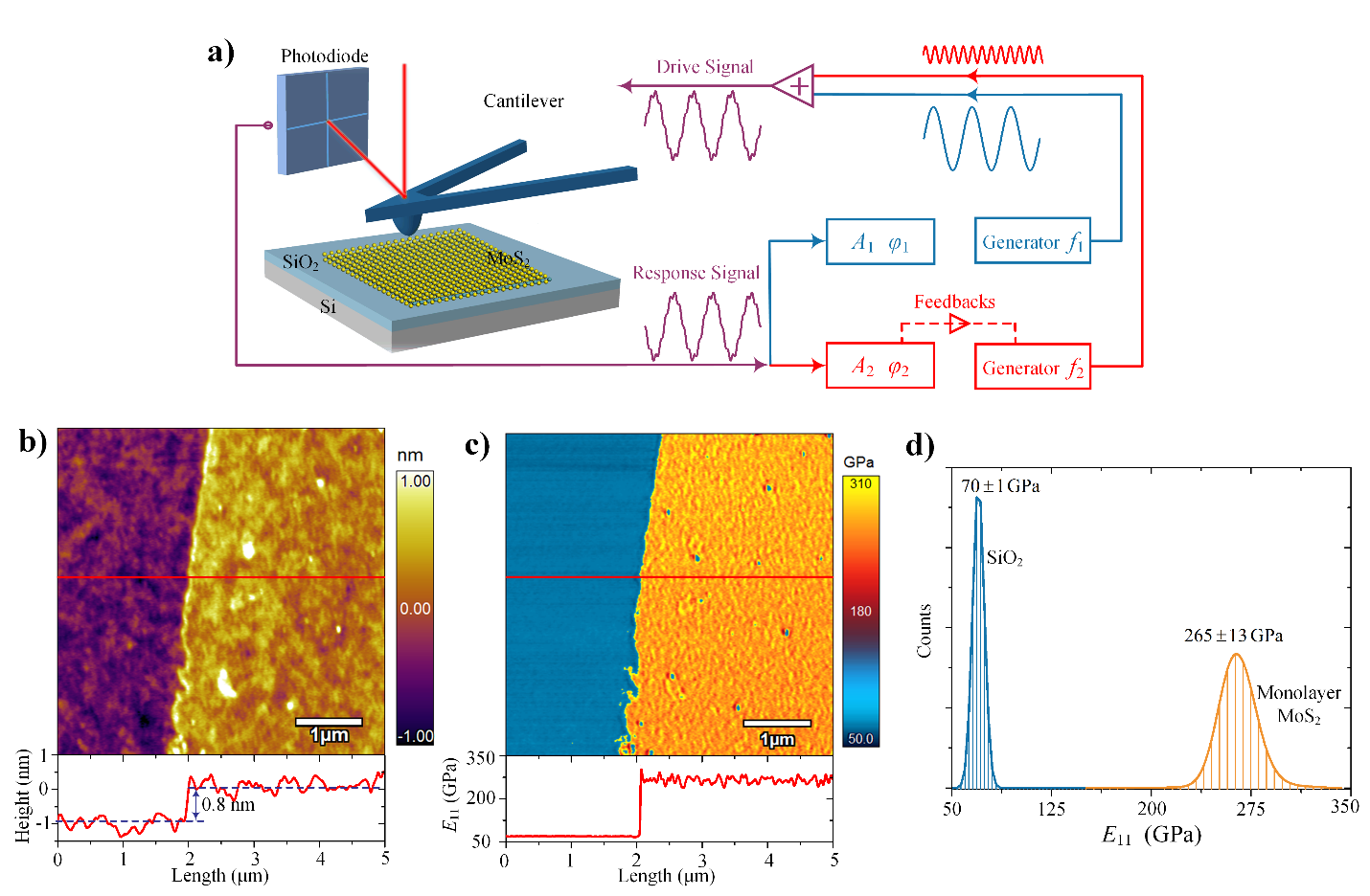 (a)双频原子力显微镜示意图;(b)SiO2基底和单层MoS2的形貌;(c)SiO2基底和单层MoS2的面内杨氏模量;(d)SiO2基底和单层MoS2的面内杨氏模量直方图。