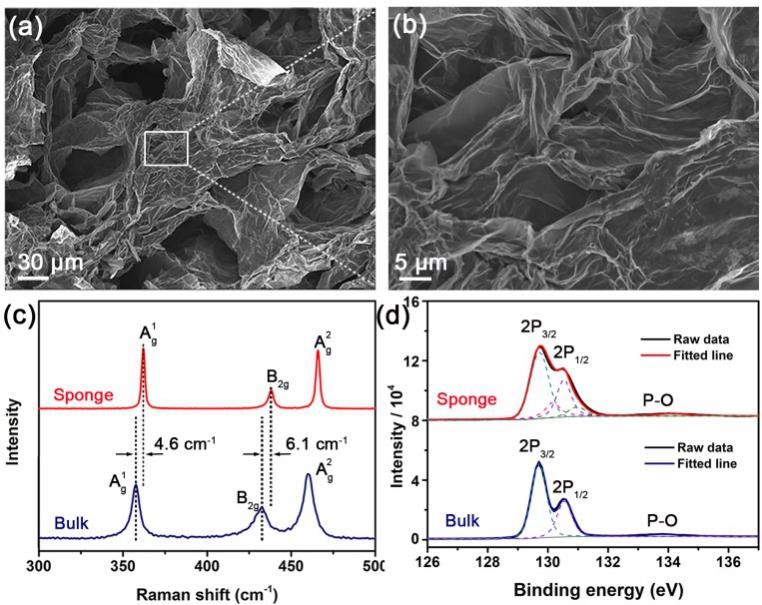 图2. 三维黑磷的扫描电镜图(a,b);三维黑磷和块体黑磷的Raman图谱(c)和XPS图谱(d)