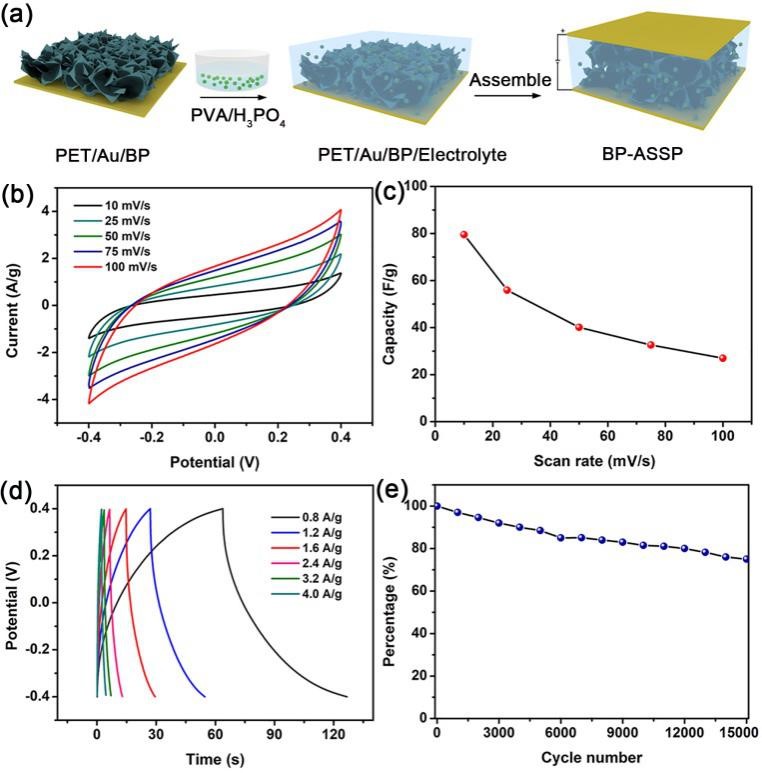 图3.全固态超级电容器的制备示意图(a),不同扫速下的cv曲线图(b),比容量随扫速的变化曲线图(c),GCD曲线图(d),稳定性测试曲线图(e)