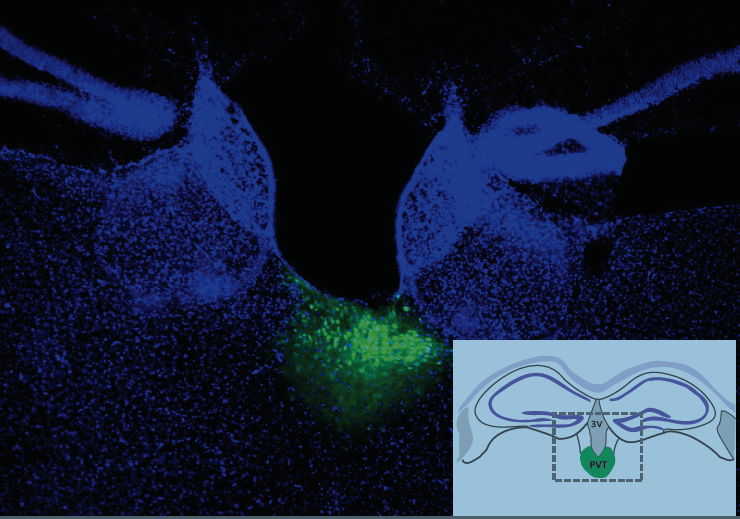 科研人员首先训练小鼠进行嗅觉巴浦洛夫条件性学习,将不同的气味刺激跟奖赏(水)或者惩罚(吹气或电击)偶联起来,发现位于大脑中部的丘脑室旁核(PVT)神经元能够被重要的事件所激活,无论是奖赏和惩罚性刺激都能激活PVT。