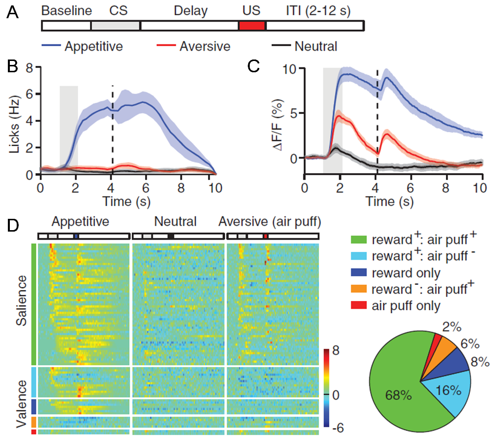 图2:PVT 编码了刺激的显著性。 A:嗅觉巴甫洛夫条件性学习实验范式; B: 小鼠行为; C:光纤记录显示无论奖赏还是惩罚都能激活PVT; D:电生理记录显示单个PVT神经元能够被奖赏和惩罚所激活,从而编码了刺激的显著性。