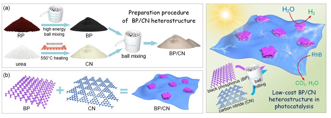 新型二维半导体材料黑磷,具有带隙可调、吸收范围广、载流子迁移率高等特点,在能源与催化领域具有广阔的应用前景。并且,黑磷与石墨相氮化碳(以下简称氮化碳)的复合可得到具有优异光催化性能的异质结催化剂。然而,当前该异质结的原料成本高、产率低,限制了其长远发展与应用。因此,开发高性能且低成本的黑磷基异质结催化剂具有重要的科学意义和应用价值。