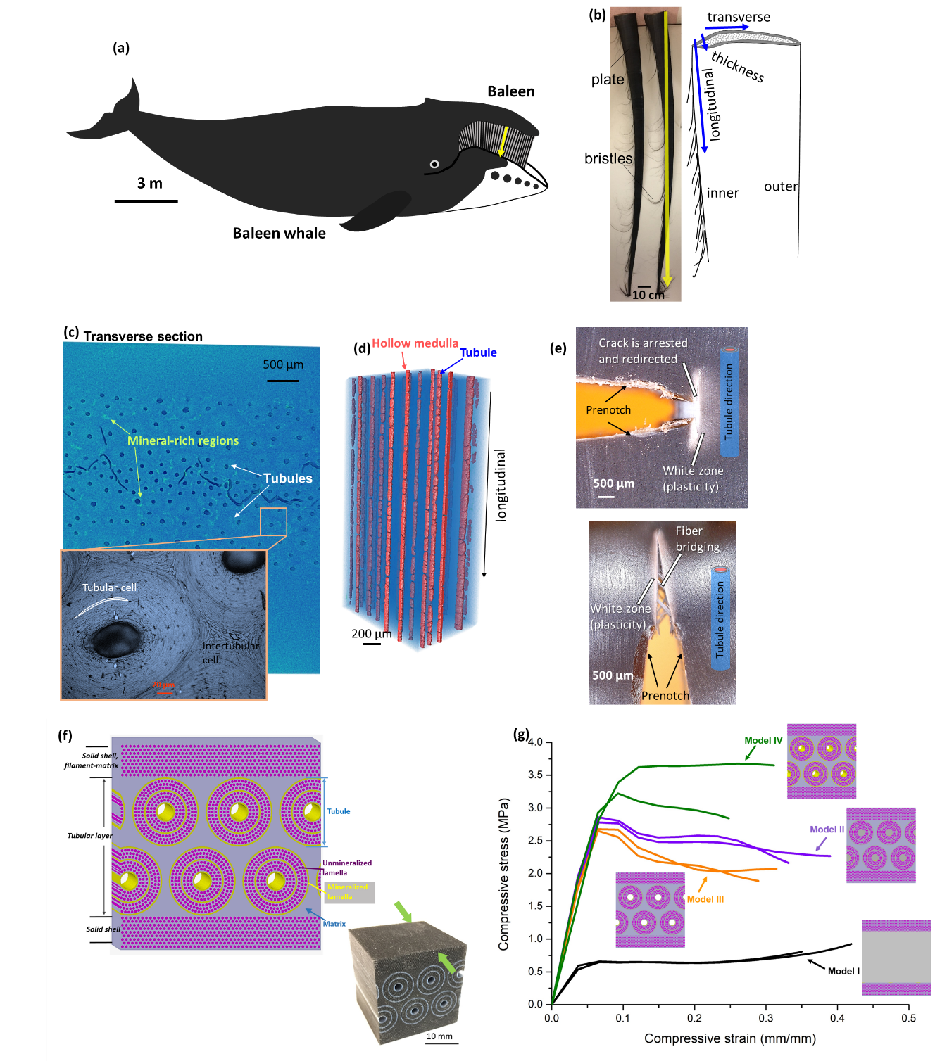图1. (a)须鲸及其鲸须, (b)鲸须板及取向示意图, (c)鲸须micro-CT及光学图像的横截面, (d)鲸须中间细管层 平行于纵轴方向的细管及中空髓腔, (e)横向及纵向加载时含有预制裂纹的鲸须板在裂纹扩展过程中表现的韧化机制,(f) 计算机辅助建立的多层级结构模型及3D打印出的仿生结构模型,(g)仿生结构模型在不同加载速率下的压缩应力应变行为。