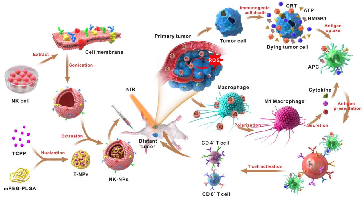 继手术、化疗和放疗后,免疫疗法已成为癌症治疗的一种主要治疗方式。它不仅能够高效、安全地根除原位肿瘤,而且能通过激活机体免疫系统来识别和清除残留的肿瘤细胞,防止肿瘤转移和复发。团队开发了一种细胞膜免疫治疗策略,它能够通过NK细胞膜伪装纳米颗粒(NK-NPs)来消除原发性肿瘤并抑制远处肿瘤生长。通过蛋白质组学方法分析NK细胞膜的蛋白质组分和功能,团队发现NK细胞膜的存在使NK-NPs具有肿瘤靶向性,并且诱导巨噬细胞向M1型极化以产生抗肿瘤免疫。同时NK-NPs中的光敏剂TCPP可通过光动力疗法诱导肿瘤细胞发生免疫诱导死亡以产生损伤相关分子,从而增强NK细胞膜肿瘤免疫治疗效率。这种细胞膜免疫治疗法为肿瘤免疫疗提供了新的方法和策略。
