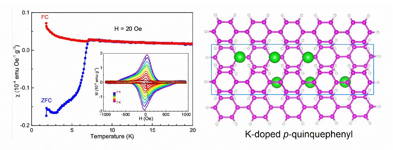 图1.(左)钾金属掺杂五联苯体系的磁化率-温度曲线,超导转变发生在7 K左右;(右)超导相的微观原子结构。