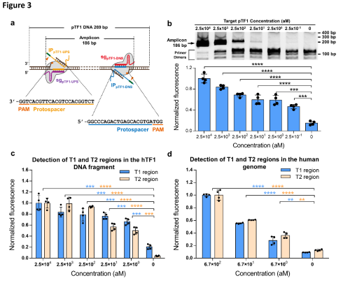 图2: 利用CRISDA技术对aM量级的靶分子进行特异性扩增检测。(a)扩增体系设计;和(b)利用CRISDA技术对合成的DNA片段进行特异性扩增检测。(c)利用CRISDA技术对来自人基因组的DNA片段进行特异性扩增检测。(d)利用CRISDA技术对人基因组的特定区域进行特异性扩增检测。