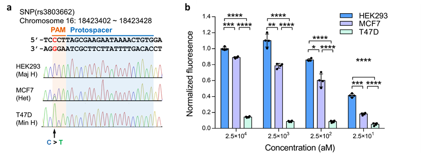 图3: 利用CRISDA技术对aM量级的靶分子进行SNP扩增检测。(a)不同细胞株基因组中rs3803662位点的测序验证;(b)利用CRISDA技术对该SNP位点进行高灵敏度扩增检测。