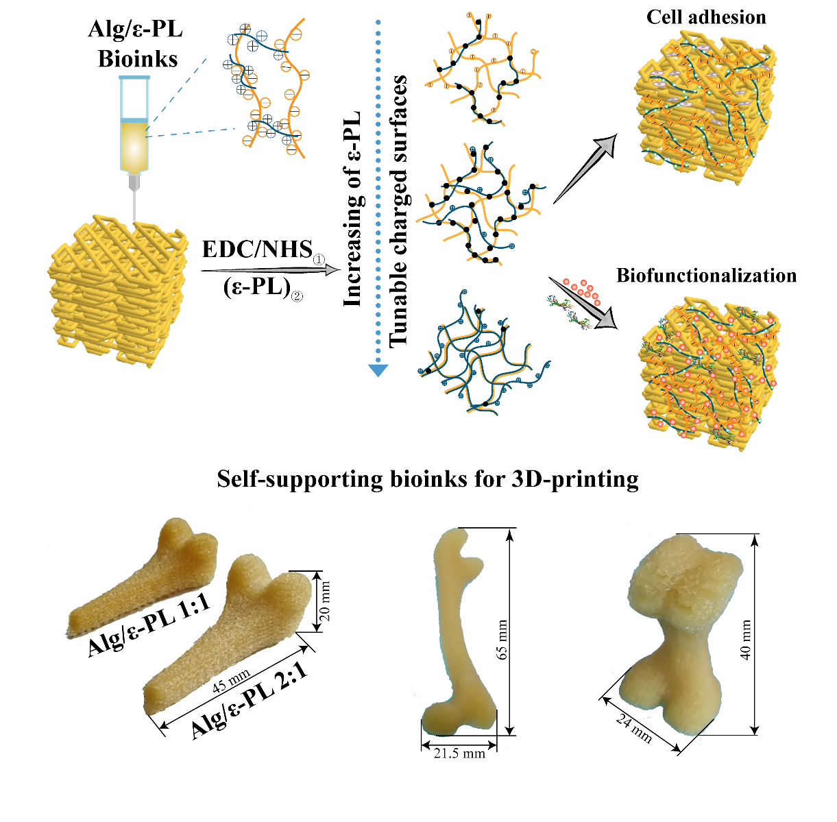 海藻酸盐是聚阴离子型多糖,能与钙离子等阳离子快速交联成型具有优异的打印性能,因此是目前生物打印最常用的生物墨水之一。但该传统体系所构建支架力学稳定性差和生物活性弱,严重限制了其临床应用。针对此问题,团队首次提出基于海藻酸盐/聚赖氨酸基新型聚电解质生物墨水,在富含氨基的聚赖氨酸与海藻酸盐上的羧基电荷吸引作用下,可在常态中实现大尺寸自支撑结构支架的打印。通过进一步对支架进行交联,实现支架表面电荷可调控性,避免使用钙离子作为交联剂,并且提高了支架长期的稳定性。基于可调控的支架表面电荷,海藻酸盐/聚赖氨酸支架不仅促进了细胞的黏附,而且实现了多种活性因子的吸附和缓释,体外细胞实验证实了负载的细胞外基质或生长因子能够显著提高海藻酸盐的生物活性。