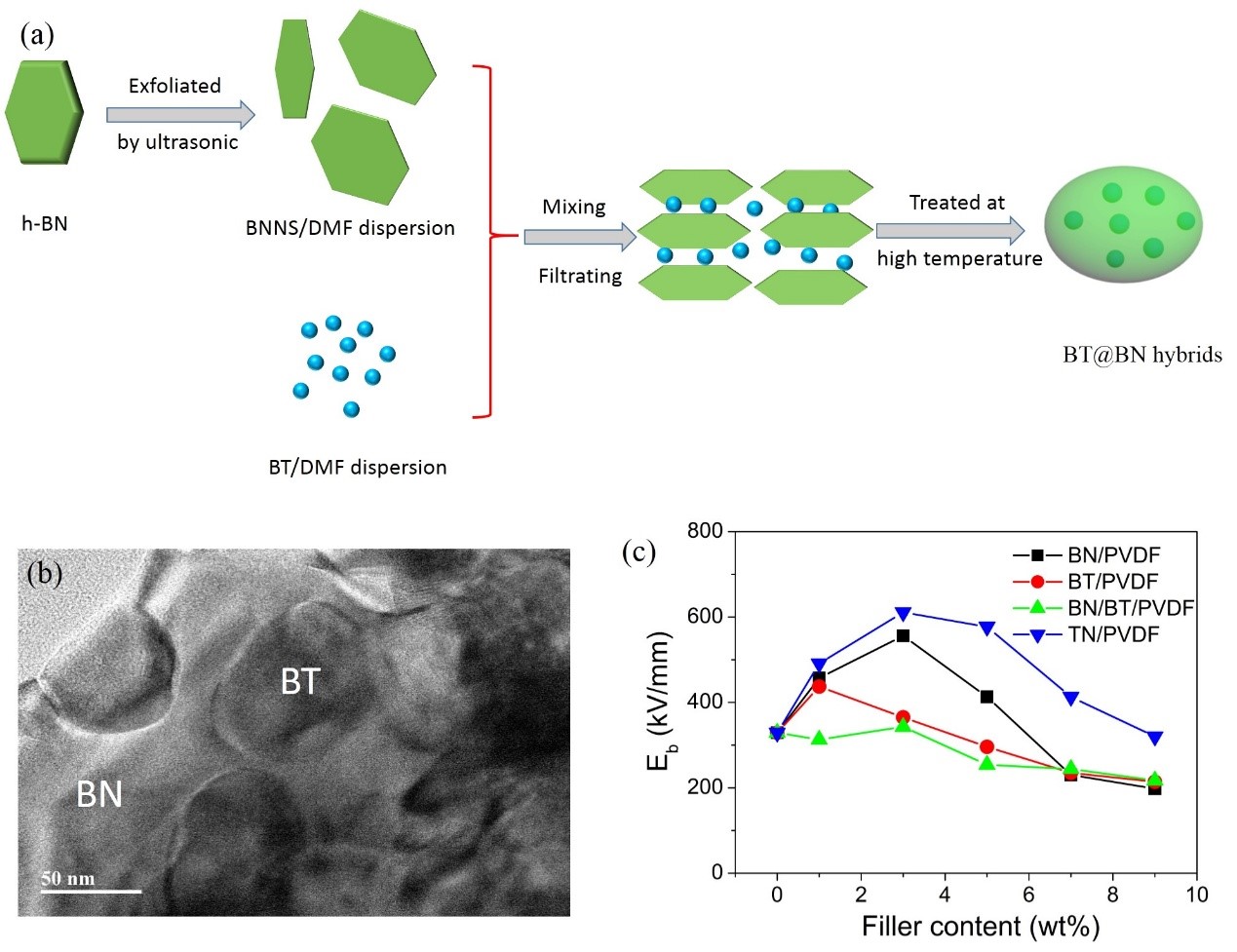 图(a) BT@BN复合颗粒的制备流程示意图;(b) BT@BN复合颗粒TEM照片;(c) 复合材料击穿强度。