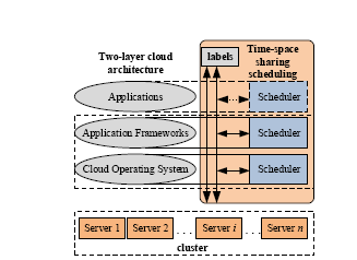 该工作针对共享云环境下系统软件栈多层次调度器之间不协调的问题,提出了基于纵向标签的协同调度机制—时空共享调度抽象TPShare。由于当前云计算系统软件栈调度层次多,包含了单节点操作系统调度器,云操作系统调度器以及应用框架中的任务调度器(如Spark),而各层次间的调度状态无感知、不协调问题,不仅导致了集群资源浪费现象,而且严重影响了应用程序的性能。TPShare通过基于双向标签的通信协议设计,实现相邻调度层之间调度状态/资源需求等关键信息的流动和有效利用。基于云计算操作系统Mesos和数据分析应用框架Spark,流处理框架Flink, 该论文开发出了一个TPShare抽象的实现原型。实验表明,在各类应用混部的环境下,TPShare不仅能提高云调度器的吞吐率2x以上,而且有效降低了延迟敏感应用的尾部延迟,平均达45%。