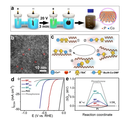 图1.(a)钴掺杂磷烯制备过程。(b)钴掺杂磷烯的高倍暗场透射图。(c)制备原理示意图。(d)不同过渡金属掺杂磷烯的极化曲线图。(e)析氢反应中氢吸附/脱附能吉布斯自由能图。