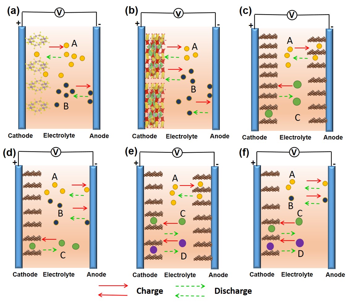 基于不同多离子结构的二次离子电池工作原理示意图:图(a-c)不同双离子结构;图(d-e)不同三离子结构;图(f)四离子结构。其中A与B表示活性阳离子,C与D表示活性阴离子。