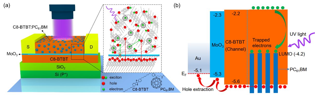 为解决以上问题,研究团队首次提出了一种新颖的复合式分层光电晶体管结构,该结构由用于载流子高效传输的C8-BTBT沟道层、高效的C8-BTBT:PC61BM体异质结光活性层以及二者之间的超薄MoO3空穴传输层组成(图1)。在光活性层中产生的激子在体异质结处被有效分离,产生的电子被受体PC61BM捕获(CTE效应),空穴则注入沟道层,无机MoO3可以进一步促进空穴的注入并阻挡电子,从而有效地抑制电子-空穴复合。更进一步,具有高迁移率的C8-BTBT沟道层为空穴的传输提供了畅通无阻的“高速公路”,空穴在沟道中得以自由和高速地传输。因此,通过对光生激子的产生、分离、传输以及复合抑制的各个环节进行巧妙设计和优化,最终实现了光电晶体管光探测性能的大幅提升,光敏性photosensitivity (Ilight/Idark)达到2.9×106 ,光响应性(Photoresponsivity)达到8.6×103 A/W,光探测率(Detectivity)为3.4×1014 Jones,在弱光照射下(32μW/cm2),外部量子效率为3×106 %。