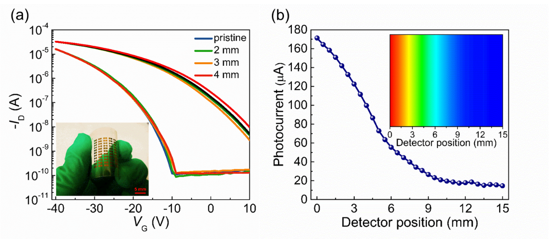 不仅如此,在器件应用层面,研究团队利用这一新颖结构,制备了柔性的光电探测器件,并通过弯曲实验验证了该结构在柔性器件中良好的可靠性(图2a)。与此同时,研究团队也制备了光电晶体管的阵列结构,验证其在光成像应用中的优异潜力(图2b)。