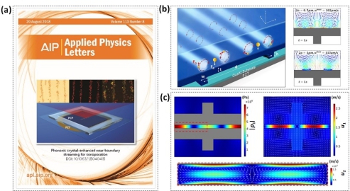 图1(a)Applied Physics Letters期刊封面;(b)颗粒在声子晶体调制声场中的声泳运动示意图和计算得到的不同尺寸颗粒的运动轨迹;(c)双声子晶体板亚波长狭缝中的声压场p1、声质点速度场u1和超快速类Rayleigh流场u2