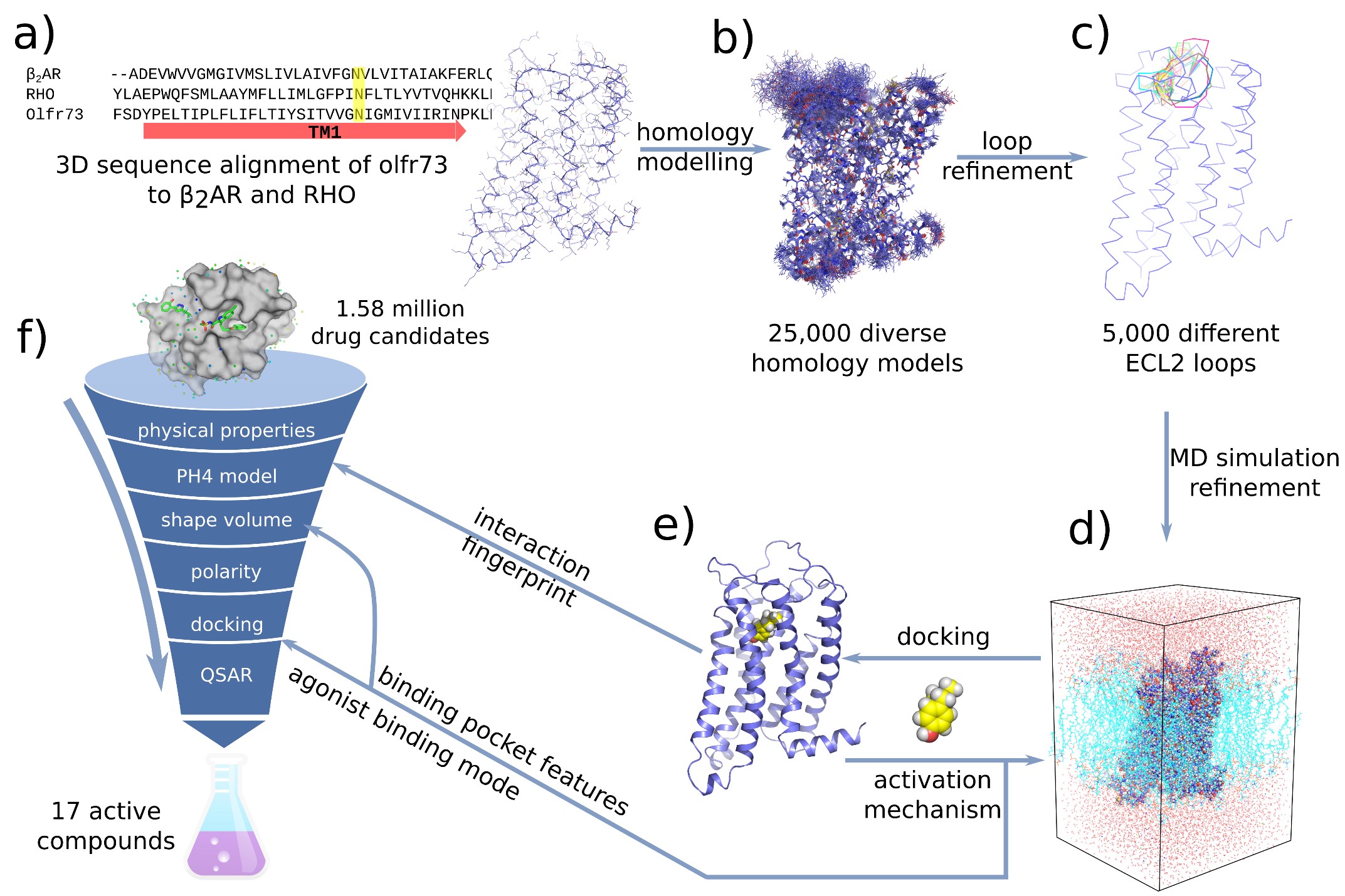 在本工作中,研究人员首先通过计算机模拟的方法构建出嗅觉受体蛋白Olf73的三维结构模型(同源性与晶体结构只有18%)。然后通过分子动力学的方法优化初始模型的三维构象。在通过人工智能和计算机虚拟高通量筛选药物分子的方法预测158万个化合物库中有25个新型分子可能是有活性的。最后生化实验证实,所预测的化合物中17个确实是有活性,命中率高达68%。