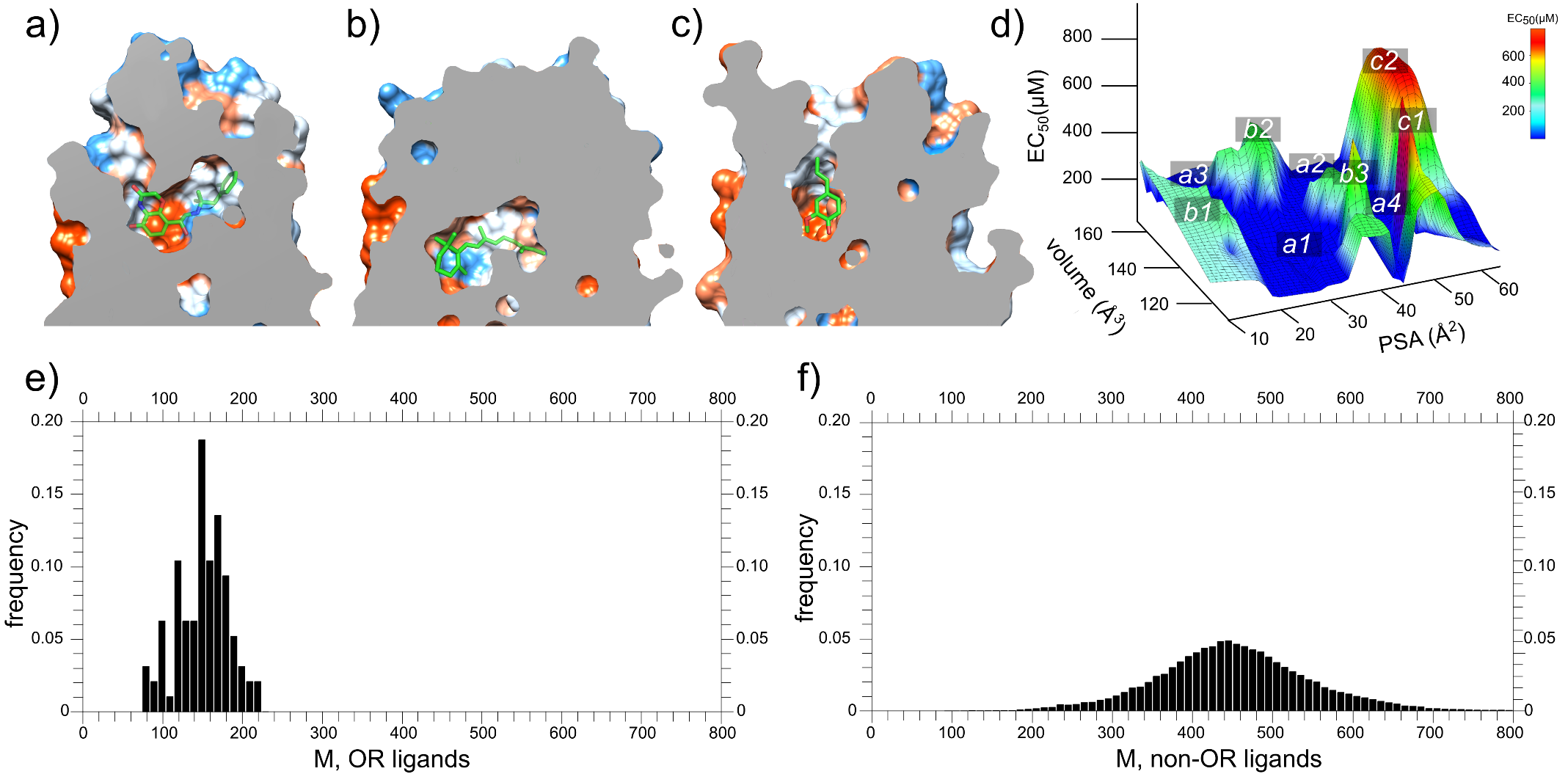 除此之外,研究人员还发现嗅觉受体蛋白的药物分子的分子量比其他GPCR家族要小很多,并且活性要小不少。通过人工智能分析药物分子与靶标蛋白的相互作用指纹图谱发现,嗅觉受体蛋白的药物分子主要以疏水作用为主,而其他GPCR的活性分子则以氢键和盐桥作用为主。功过系统分析GPCR的药物分子结合位点的大小,进一步发现嗅觉受体蛋白的位点比其他GPCR明显要小很多,结合位点区域的电荷也比其他GPCR要少很多。这些因素综合导致了嗅觉受体蛋白的活性分子整体活性比其他GPCR要小不少。