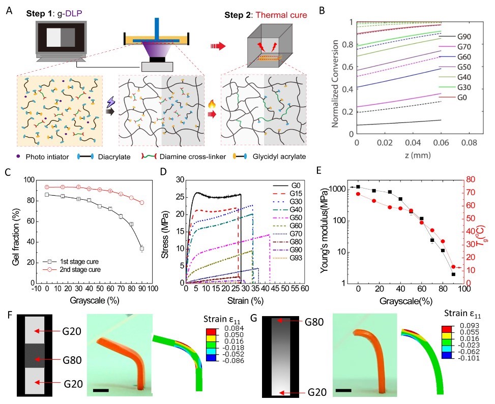 图一:灰度数字光处理3D打印梯度材料。(a)打印树脂成分和成型原理;(b) 单层曝光(实线)与打印多层曝光(虚线)的反应转化率沿厚度方向的模型预测值(G0代表最强光,G100代表全暗的最弱光);(c)凝胶转换率与灰度值的关系(实验);典型的3D打印数字材料的应力应变曲线(d)与杨氏模量(e);离散(f)与连续梯度灰度(g)材料的弯曲变形(实验与有限元模拟)。