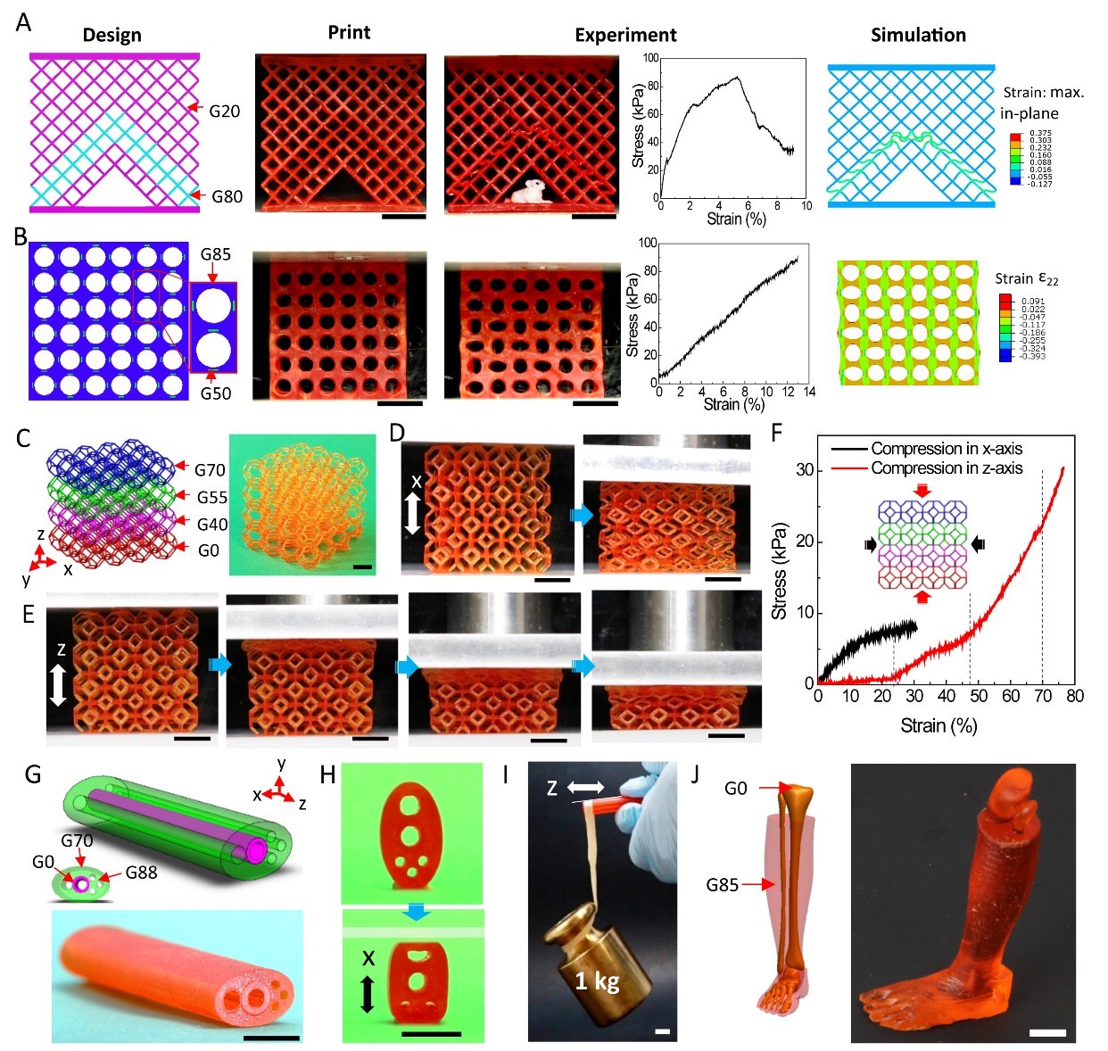 图二:灰度数字光处理3D打印梯度超材料的功能性应用。(a)可局部变形的二维栅格结构;(b)负泊松比二维多孔材料;(c,d,e)各向异性的三维栅格结构;(G,J)手术前假肢打印:硬材料模仿骨头、软材料模仿肌肉、空心结构模仿血管,不仅可以模仿器官的复杂结构,更能模仿不同组织的软硬差别。