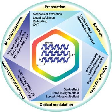 二维黑磷是近年来脱颖而出并受到广泛关注的新型半导体材料。凭借优异的光子学及光电子学材料特性,黑磷在各类光子和光电器件应用中表现出优异潜力。首先,黑磷具有灵活可调的直接带隙,这为光电器件提供了从可见跨越至中红外的宽光谱高效光电响应。其次,从晶体管器件的迁移率和开关比这两个关键性能来考虑,黑磷填补了石墨烯和过渡金属二硫化物之间的空隙,为晶体管器件提供了理想的平衡性能。不仅如此,黑磷的面内各项异性对材料的电学、光学以及机械性能等具有极大影响,从而为深入探索新颖的光电基本原理以及实现光电器件新功能应用提供了一个优秀平台。因此,近年来针对黑磷光子学及光电子学特性的基础研究与应用开发,已成为相关学者研究的热点。