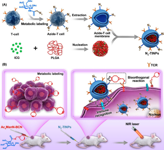 蔡林涛研究员及其团队成员韩雨彤、潘宏、李文军和郑明彬,在团队前期工作基础上(Advanced Functional Materials,2019,1807528;ACS Nano,2016,10,10049;ACS Nano, 2014, 8, 5468;Small, 2019, 15, 1804383;Small, 2017, 13, 604036;Biomaterials, 2018, 181, 199),首先采用糖代谢技术将叠氮基团(N3)嵌入T细胞膜中,然后将提取的N3功能化的T细胞膜覆盖在吲哚菁绿(ICG)/聚合物纳米核心表面,构建了仿生纳米光敏剂(N3-TINPs)。T细胞膜上的特殊蛋白(T细胞抗原受体,TCR)赋予了N3-TINPs的肿瘤细胞免疫识别能力,而且功能化的N3基团能够与肿瘤细胞上糖代谢标记的人工靶点(双环[6.1.0]壬炔,BCN基团)发生高效、特异的生物正交反应。