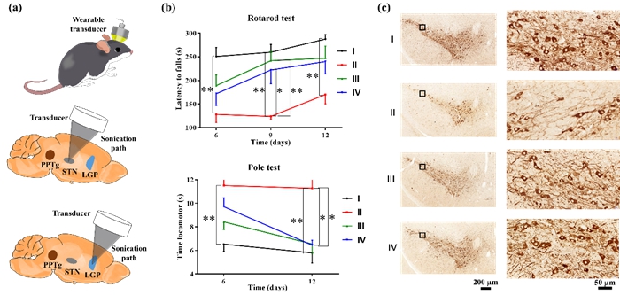 图:(a)利用头戴式超声换能器调控小鼠深部核团;(b)超声脑深部刺激可以改善PD小鼠的运动功能;(c)超声脑深部刺激降低黑质多巴胺能神经元的凋亡。I: 正常小鼠+假刺激,II: PD小鼠+假刺激,III: PD+超声刺激STN,IV: PD+超声刺激GP。