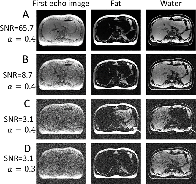 磁共振成像是目前肝脏脂肪定量准确的手段,其独特的质子密度脂肪分数(PDFF)能够精准反映肝脏细胞中脂肪比例,并且与病理结果高度一致。然而,在临床肝脏扫描中,为了避免水脂T1差异对定量结果造成影响,通常使用小角度激发的快速梯度回波序列,并配合并行成像等快速成像技术以保证扫描速度,这些因素均会导致图像信噪比的急剧下降,使得磁共振脂肪定量技术中固有的水脂二义性的问题在低信噪比图像中暴露出来,并影响最终定量结果。