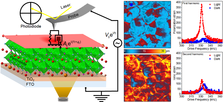 图:光电扫描探针显微技术示意图(左图)、局域光致极化增强(中图)、光照前后单点一阶、二阶压电响应对比(右图)