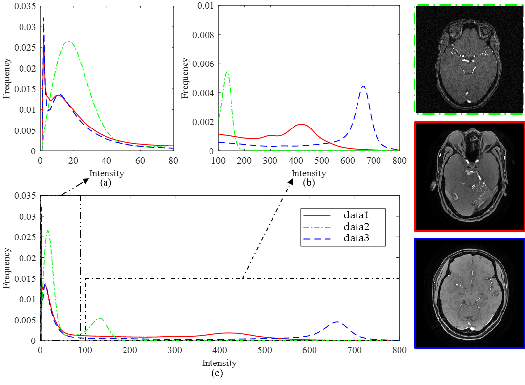 图一: 三个不同临床磁共振设备采集的数据直方图
