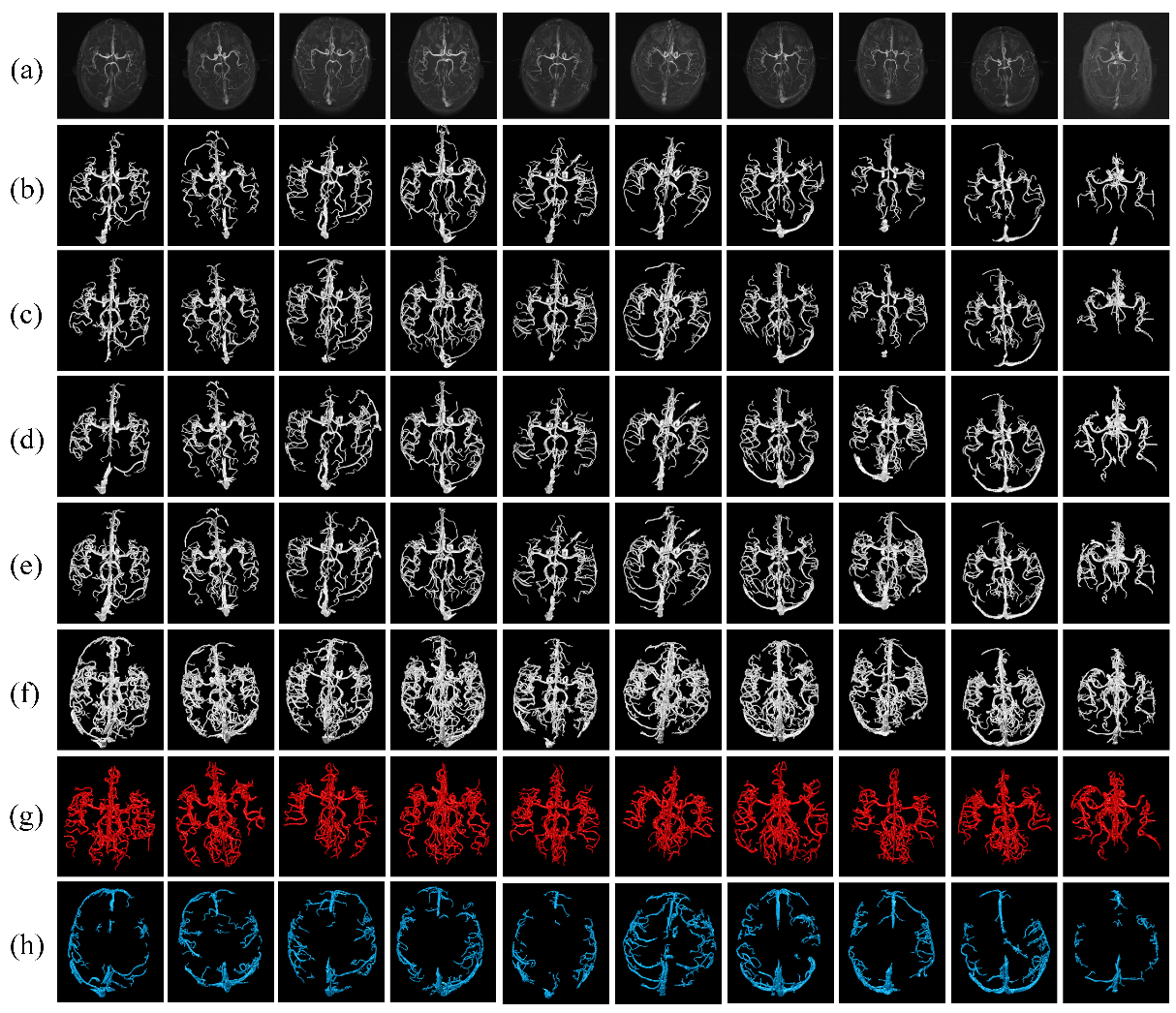 图四:由左至右为十套脑磁共振血管造影数据的分割结果:(a)原始TOF-MRA造影数据的最大密度投影视图;(b-e):4种对比方法;(f):本文所提方法;(g-h):动静脉分离结果
