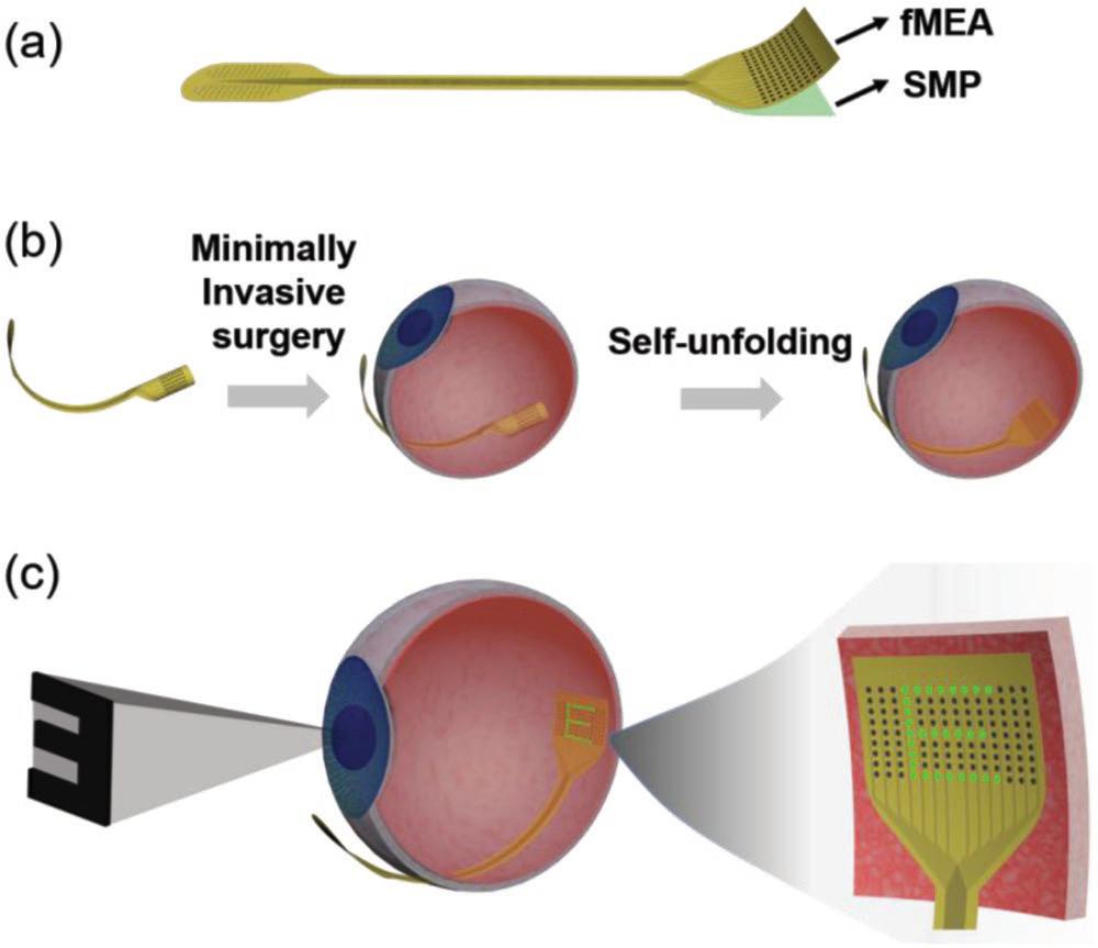 图1 (a)具有形状记忆高分子涂层的柔性神经电极示意图。 (b) 自展开智能柔性神经电极的微创植入贴合视网膜示意图。(c) 有效贴合在视网膜上高密度宽幅神经电极有望获得更好的刺激效率和更宽的视野。