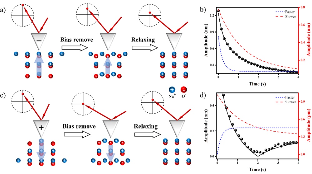 基于此,团队采用具有电化学活性的浮法玻璃作为双离子微观动力学的研究对象,利用电化学应变显微技术(ESM)对其进行了纳米尺度电化学性能表征,并通过有趣的离子弛豫动力学曲线,揭示了双离子体系中存在Vegard电化学应变(Vegard strain)和电化学偶极矩(electrochemical dipoles)相互竞争的微观机制。同时结合相场模拟,定量测量了微观钠离子扩散系数和活化能,并与宏观测试结果一致。该方法不仅能运用于双离子电池中,在卤化钙钛矿太阳能电池、功能氧化物中也具有广泛的应用前景。