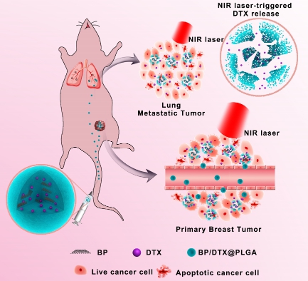 在近期的研究中,科研人员将黑磷量子点以及化疗药多烯紫杉醇(DTX)共载入聚乳酸-羟基乙酸共聚物(PLGA),合成了基于BP的多功能纳米剂(BP/DTX@PLGA)。荷转移瘤小鼠的体内分布结果显示,BP/DTX@PLGA对原发性肿瘤以及肺转移瘤均表现出优异的靶向性。此外,在近红外光诱导下,BP/DTX@PLGA表现出可控的热化疗组合治疗效应,显著地改善了单独光热肿瘤消融的治疗效率。机制研究发现,DTX的热释放以及热疗本身的协同效应诱发了肿瘤细胞的凋亡性死亡,进而导致了原发性肿瘤以及肺转移瘤的消亡。与此同时,小鼠体内和体外的结果进一步证实了BP/DTX@PLGA良好的生物相容性。此项研究为抑制癌症转移提供了一个潜在的多功能纳米治疗剂。