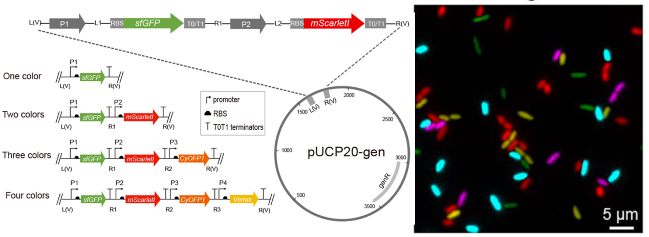 针对以上问题,合成所金帆团队提供了一套完整的多色荧光蛋白同时使用的解决方案,包括多色荧光系统的分子生物学工具盒和多种荧光信号的精准分离算法。工具盒包含启动子模块、荧光蛋白模块和载体模块3部分,可实现1-4色荧光克隆质粒的一步组装构建。而分离算法通过线性解方程组解出每种荧光蛋白在微生物细胞内的浓度,用蛋白浓度信息来表征表达水平,可实现从不同荧光蛋白贡献的混合荧光信号中对特定信号的精准分离。通过上述方案我们可以快速、方便地构建多色荧光质粒,重要的是,该算法分析获得的蛋白浓度信息相互独立,并且不依赖于拍摄参数和设备,可以进行不同设备间的数据比较。此方案不仅提供了多色荧光成像的技术方法,而且其应用将会极大地促进我们对自然或合成基因网络中各个基因之间相互关系的相关研究。