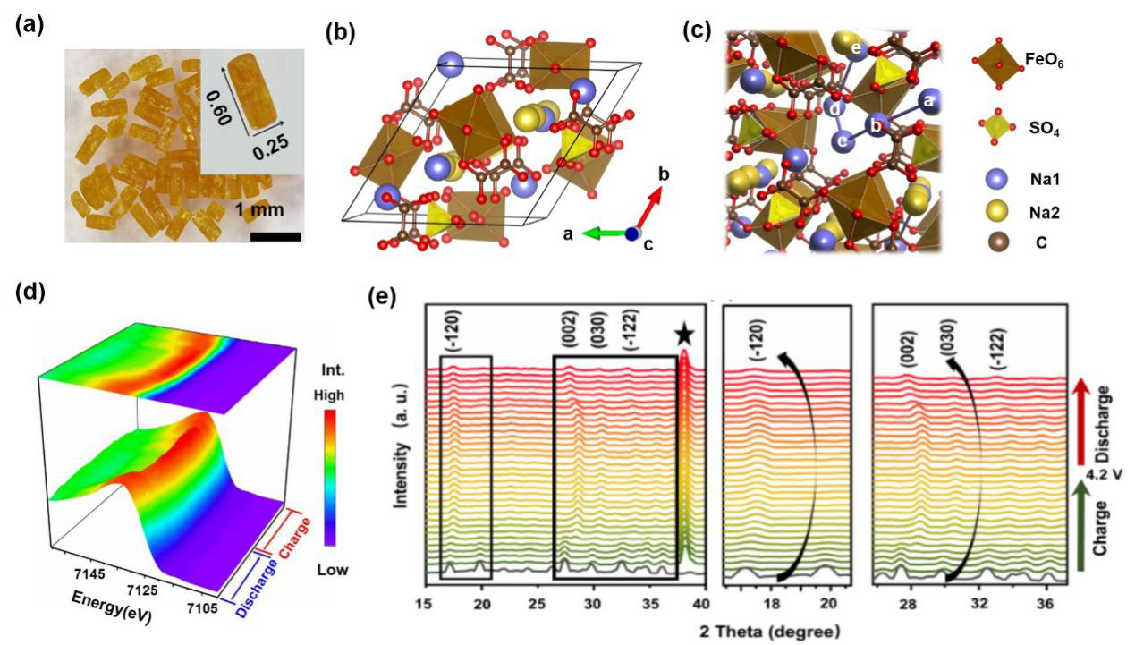 图1. 新型钠离子正极材料。 (a) 单晶材料,晶体结构解析(b)和钠离子扩散路径示意图(c),充放电过程中的同步辐射近边X射线吸收谱(d)和原位XRD谱(e)。