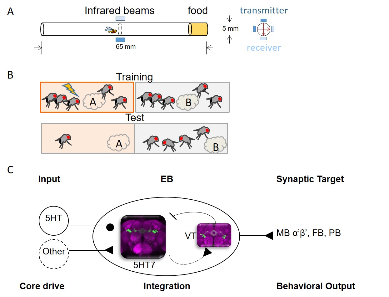 图A,检测果蝇睡眠的装置示意图。单只果蝇装入一端盛有食物的小管中,另一端封口并扎孔通气。在小管中央有一对红外发射接收器。当果蝇自由穿梭红外发射器时,打断红外线信号,由此来记录果蝇的活动特征。在果蝇中,如果有连续5分钟没有活动,就记录为一个睡眠片段;图B,检测果蝇学习记忆的实验范式。一群果蝇置入一个小管中,当呈现气味A时,电击果蝇,当呈现气味B时,没有电击,随后让果蝇在呈现气味A和气味B的两个小管中自由选择。如图所示,大部分果蝇选择了“安全”气味的小管,也即果蝇学会回避与电击同时出现的气味;图C,该研究结果的理论模型示意图。五羟色胺(5HT)这种神经递质输入到果蝇脑内椭球体(EB),通过作用于特定的5HT7受体以及EB内另一类神经元 (VT),再将信号传导到EB外的脑结构蘑菇体(MB)、扇形体(FB)、原脑桥(PB)完成对睡眠质量的调控。EB内两类神经元之间相互作用,信息整合后导致行为输出。