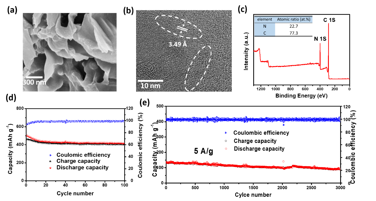 高氮掺杂微晶碳的结构及储钾性能:(a)SEM形貌表征(b)TEM显微结构(c)XPS成分分析(d)低电流密度下的电池容量(e)5 A/g大电流下的长循环性能