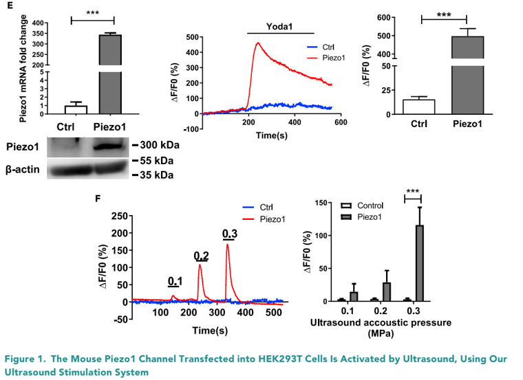 E) 验证293细胞上Piezo1的功能性过表达;F)在超声刺激下,Piezo1过表达的293细胞具有显著的钙离子内流