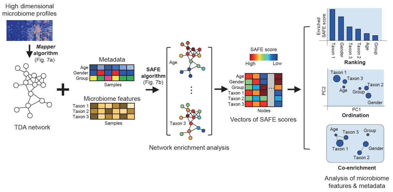 tmap的大致工作流程:将高维微生物组数据转化为拓扑学网络结构,并用于微生物组人群分层及相关性分析。
