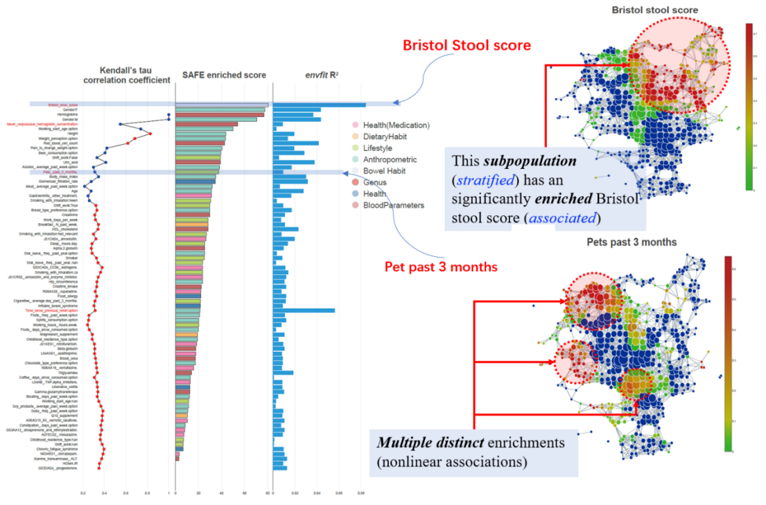以比利时队列为例,左图为关联微生物组特征与宿主表型,对宿主表型进行排序。并于传统envfit方法比较。右图表现了tmap对线性及非线性关联均有良好的捕捉。