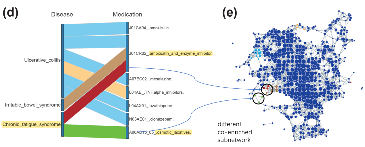 另外,本研究通过对4个数据集(包括1个合成数据和3个真实世界数据)对tmap方法加以验证,结果表明与传统的线性方法(如envfit, adonis, ADONISM)相比,tmap都表现更好,对非线性关联及潜在规律都有较好的识别。以比利时队列FGFP为例:2016年发表在Science,研究内容为健康正常人群的肠道微生物组。研究纳入了1106个粪便16S rRNA样本,及样本的69个宿主表型特征,包括了7个metadata类别:社会人口学特征,生活方式,血液指标,健康状况,饮食习惯,肠道健康状况及病史用药情况。文章表明,仅有7.63%的微生物组改变与宿主表型的变化有关。tmap提高了识别并解读population-scale的微生物组-宿主表型关联的能力。如下图所示,tmap不仅可以较好的复现envfit这种基于线性回归的方法,也在对非线性变化的捕捉上,比envfit更加灵敏。通过对FGFP数据转化的SAFE score分析,可以得到许多原始文章中没有挖掘到的规律和线索。如下图所示,比如两种药物虽然与同一种疾病相关联,但其对微生物组的影响是不同的,具体表现为在网络图上的富集部位不一样。这都是传统线性分析难以得到的。