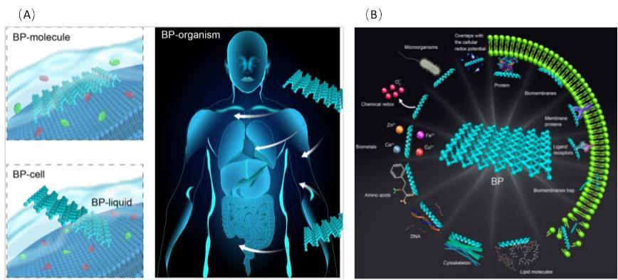 图1:黑磷-生物系统界面及其相互作用示意图。
