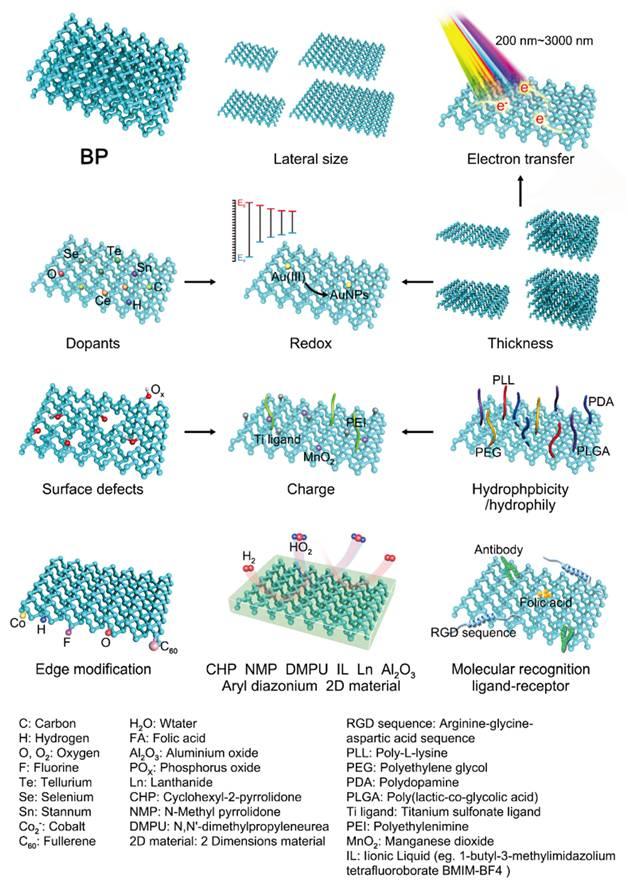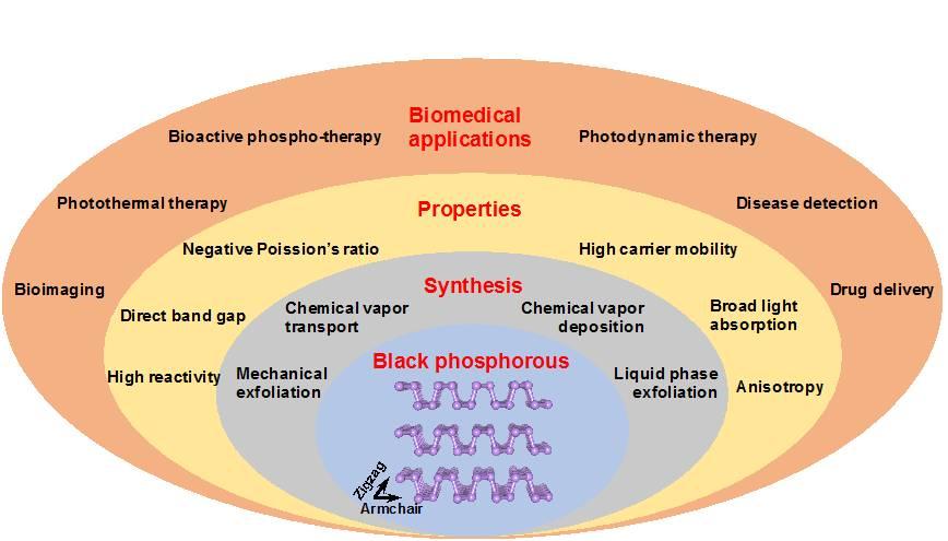 图2. 黑磷的制备方法、性质和生物医用示意图。