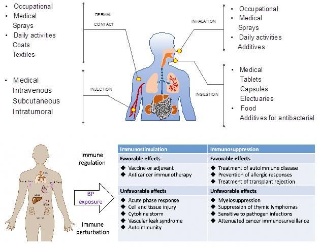 本综述中,研究团队详细讨论了在黑磷(黑磷烯)的界面性质及其相关的物理化学特性和生物效应。团队首先全面回顾了近年来黑磷的生物医学应用研究(图2)。除总结了在黑磷-生物界面上形成的相互作用方式外,还综述了黑磷应用过程中可能的多种暴露方式以及进入体内后的生物分布、细胞摄入与引起的各种生物效应如免疫效应以及基于免疫效应的应用(图3)。