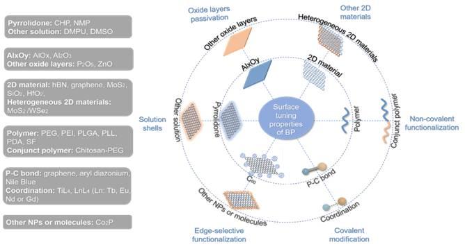 此外,研究团队还讨论了黑磷的环境行为和其进入环境后引起的潜在的环境风险。基于对黑磷-生物界面知识的积累与其生物效应的分子机制,研究团队还总结了黑磷纳米材料的安全设计方法和改变黑磷界面物理化学性质的策略(图4),特别是如何增强黑磷的化学稳定性和调节黑磷-生物相互作用等(图5),这是影响黑磷生物学行为的关键。这篇综述有助于研究者理解黑磷-生物界面、生物活性、应用中面临的挑战和相应策略,这些方法将有效促进黑磷这一新型二维纳米材料在各个领域的探索和实际应用。