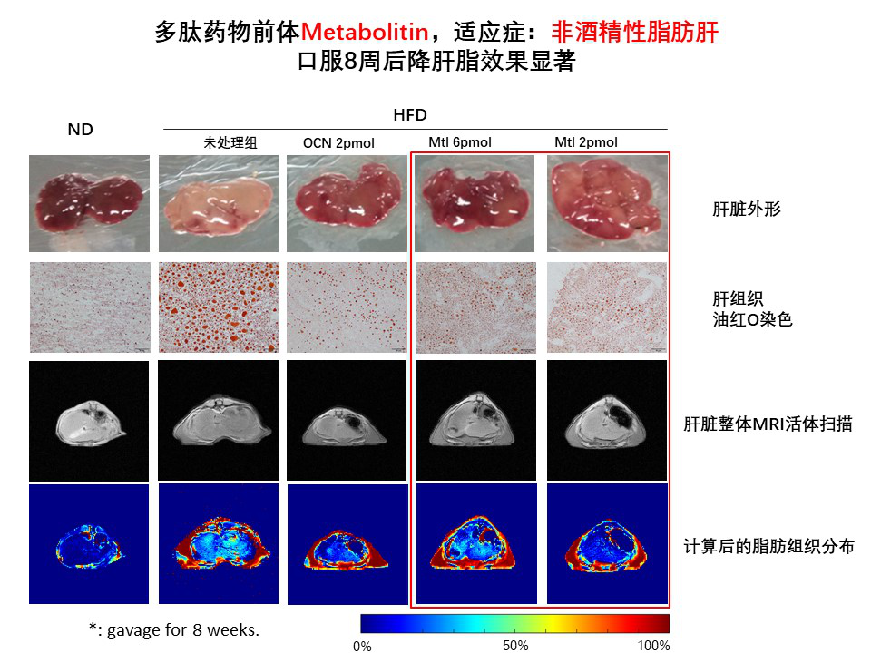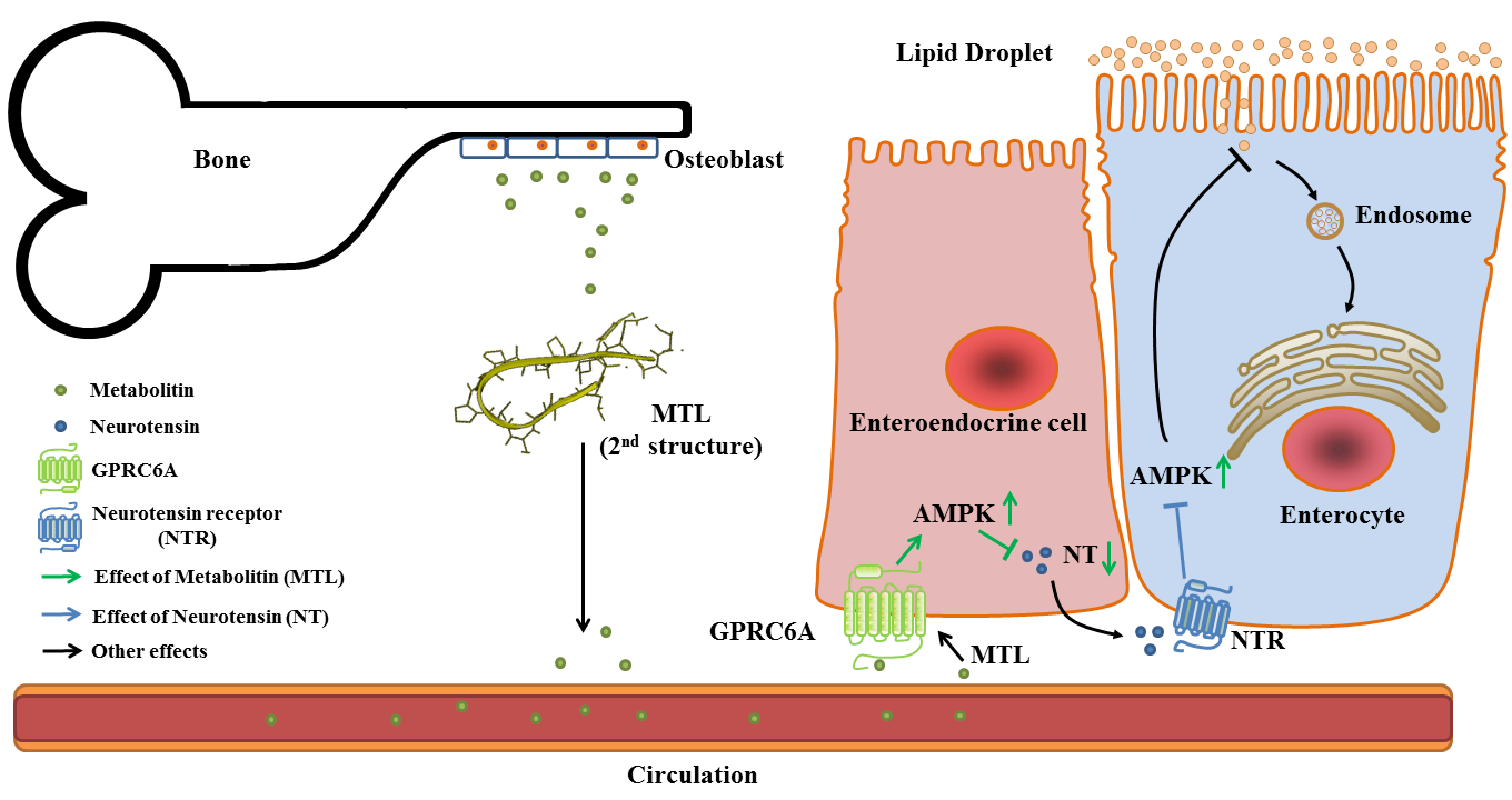 利用生物信息学手段结合生物学功能实验,研究团队验证了所预测的一种新的功能多肽的激素性质及其生物学功能,该多肽激素被研究团队命名为Metabolitin(MTL),意指调节代谢的激素,可简称为代谢素。研究团队利用高分辨质谱法验证了MTL在小鼠血清中的天然存在,并利用Obesity-NAFLD-T2DM小鼠模型证实了MTL与受体GPRC6A相互作用并发挥以下生物效应:MTL进入肠道后,与小肠上皮细胞表面的GPRC6A作用,强烈抑制神经紧张素(Neurotensin, NT)的表达,上调腺苷5’-单磷酸活化蛋白(AMPK)作用通路,通过NT-AMPK途径抑制小肠脂质的吸收。同时,MTL通过乙酰辅酶A羧化酶途径(ACC途径)抑制肝脏中的脂质从头合成,从而显著改善了小鼠的肝细胞脂肪变性、NAFLD症状和胰岛素抵抗,为非酒精性脂肪肝的治疗提供了新的药物前体和理论依据。相关药物前体已申请中国发明专利和PCT专利,并已进入欧洲、美国、日本和韩国实审。
